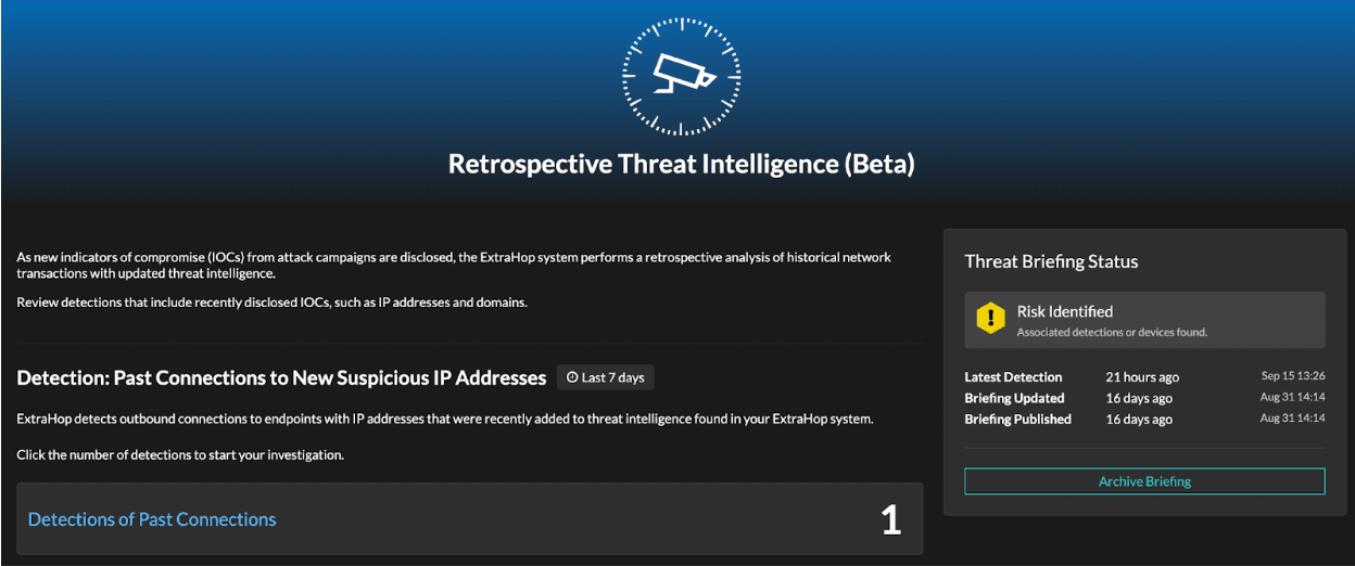 Reveal(x) 360 users are able to see our retrospective threat intelligence, which applies new threat intelligence to suspicious connections that happened in the past. These detections can help you identify broader attack campaigns.