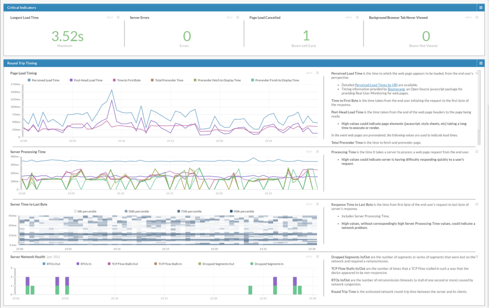 Nothing terribly exciting going on so far. The Longest Load Time widget shows us that the longest time anyone has had to wait for any page in the last 30 minutes has been 3.52 seconds -- not too bad and within our norm. We can see that our server farm was operating normally via the Server Processing Time widget. There were a couple of Dropped Segments In and RTOs In being reported on our network, but again nothing too scary so far. There is a small spike around 23:09 that looks interesting though and also notice that the Page Load Cancelled widget is not zero. We never want to see that. Let's investigate further.